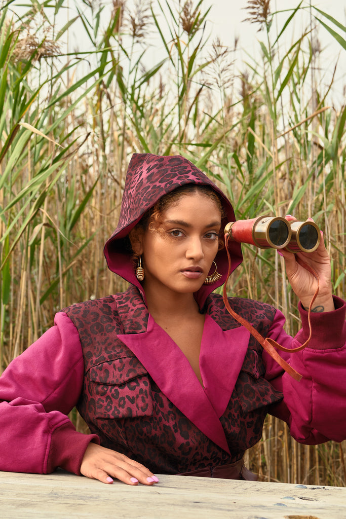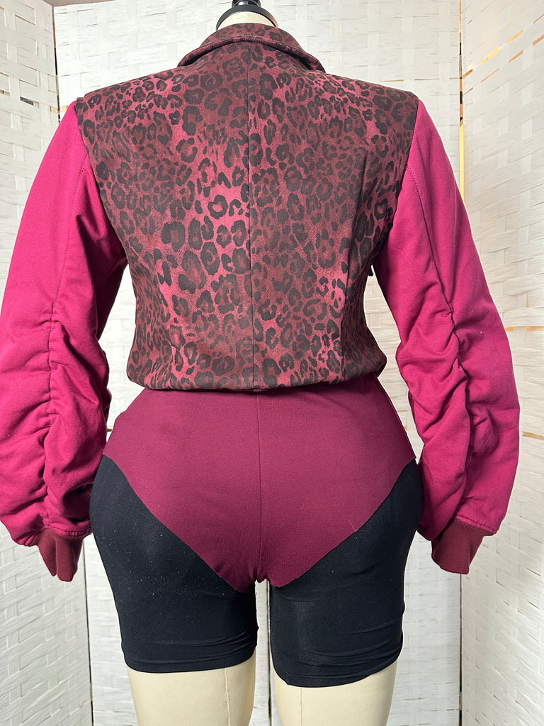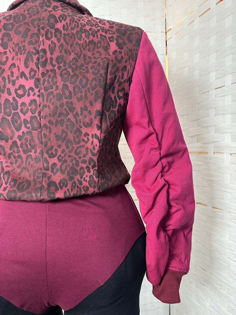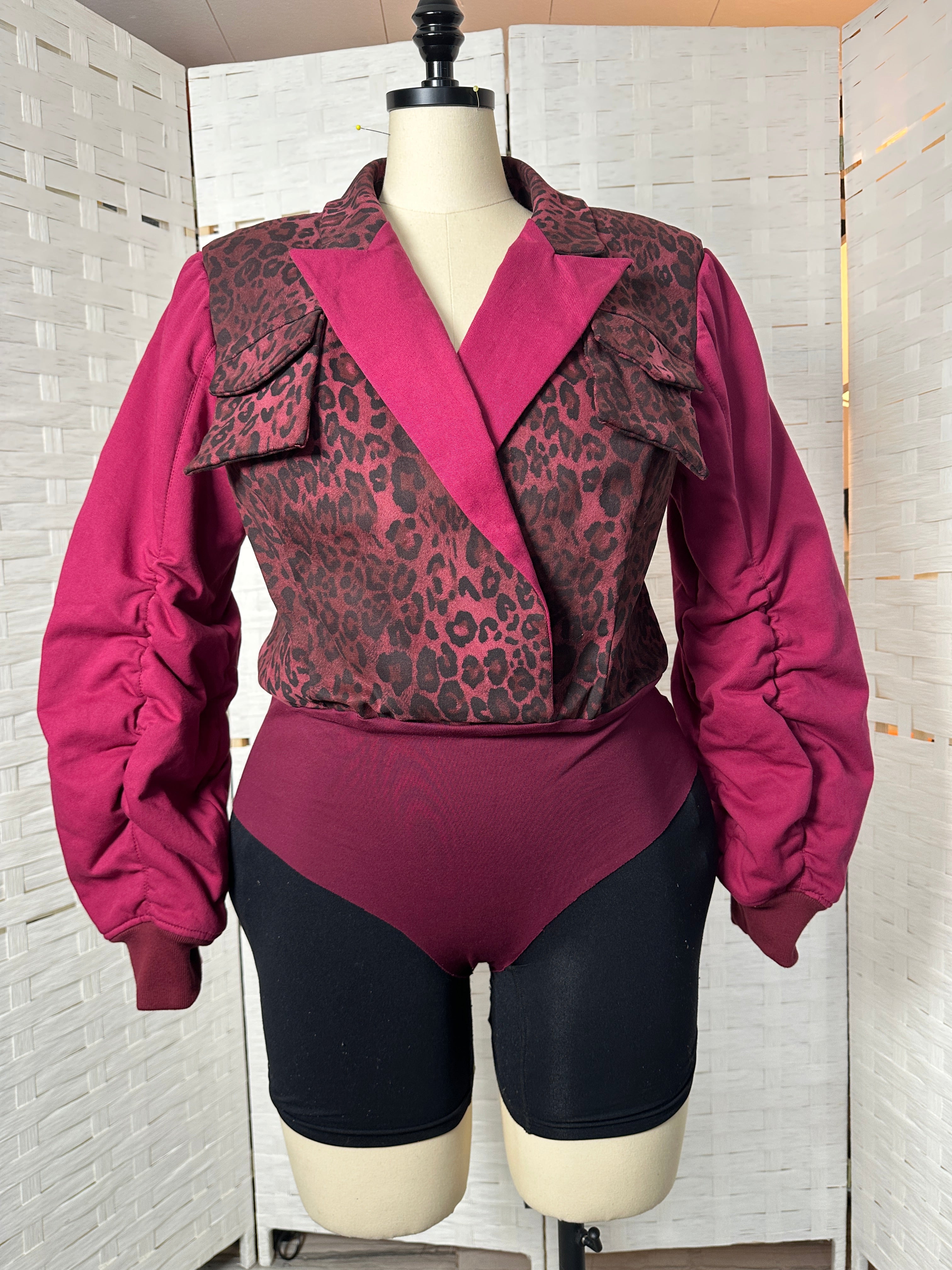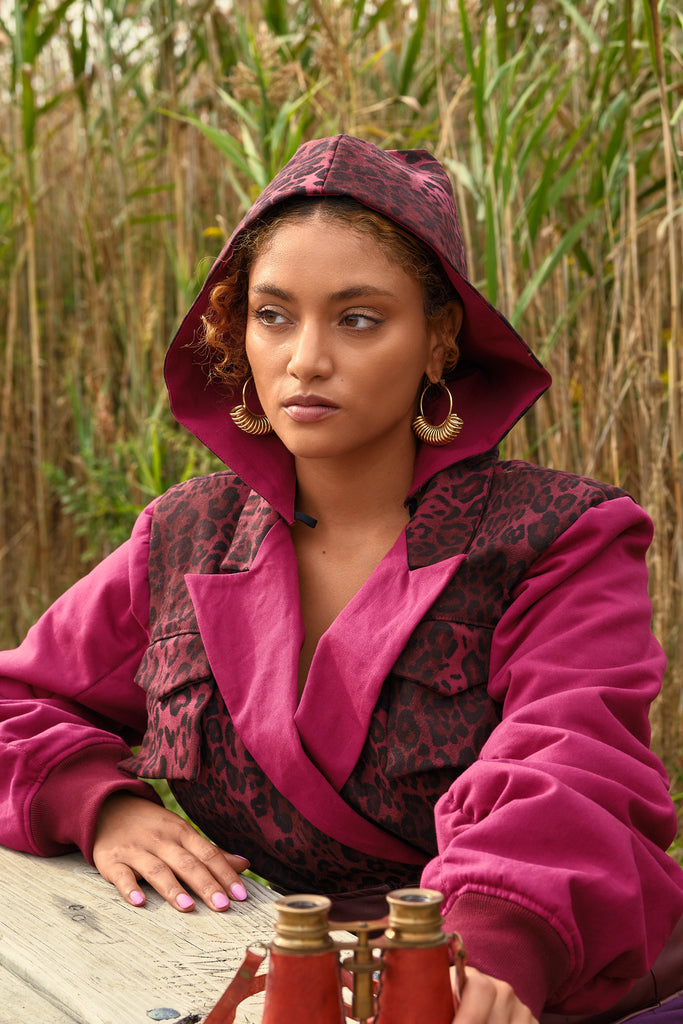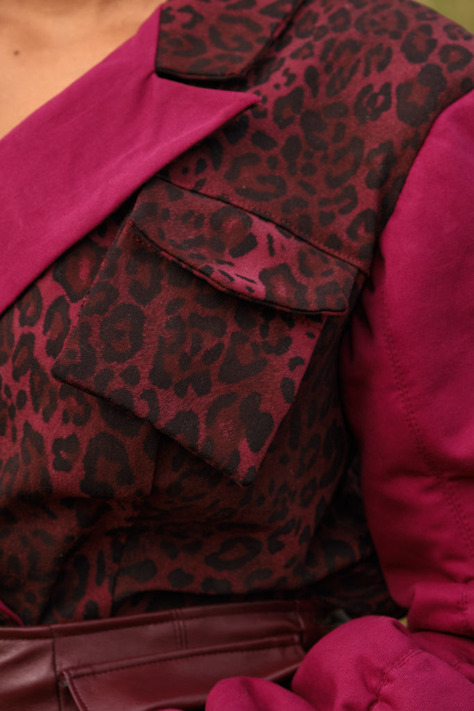 Command attention in this structured bodysuit featuring a bold contrast of deep magenta and leopard print. Designed with a detachable hood for versatile styling, this piece transitions seamlessly from statement streetwear to refined layering. The sculpted bodice and ruched sleeves create an hourglass silhouette that flatters every angle. Finished with functional chest flaps and ribbed cuffs for added dimension, this made-to-order design balances power and femininity in one look.