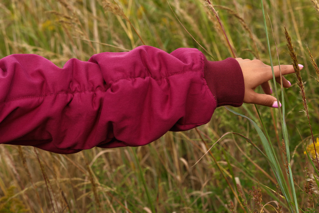 - Ruched sleeves with ribbed cuffs